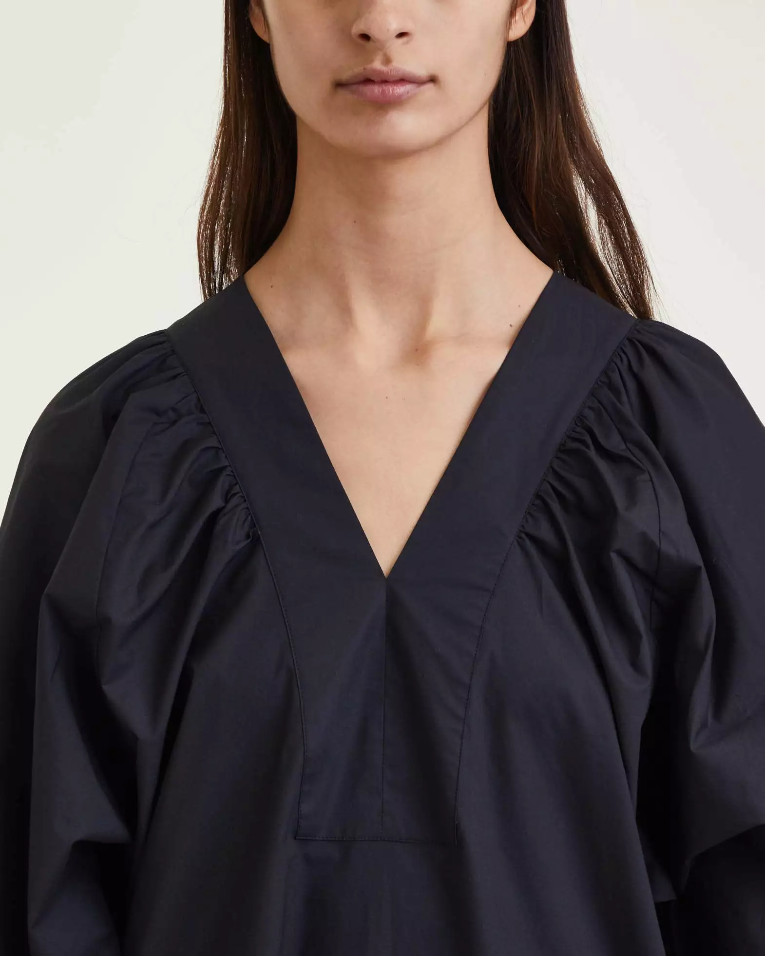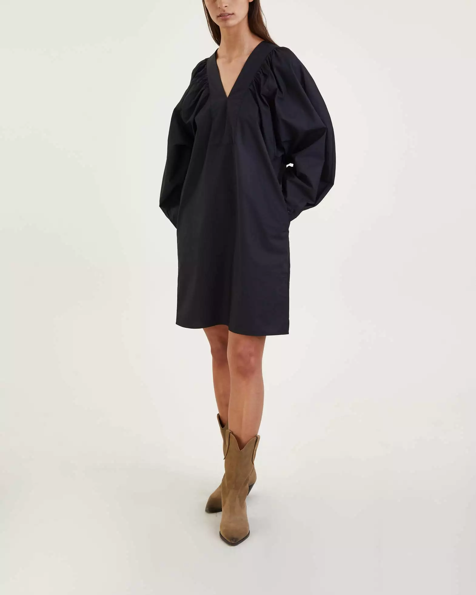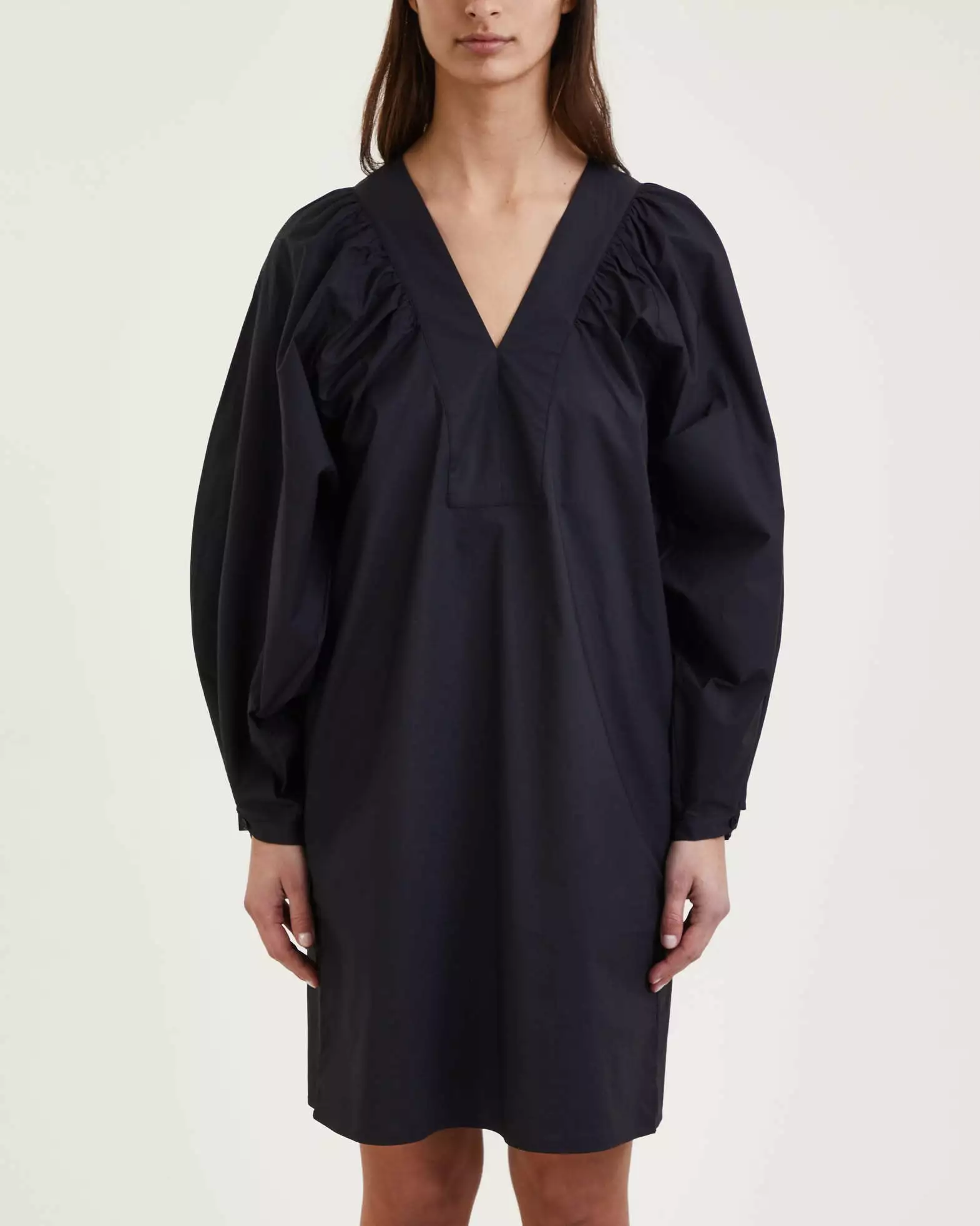 Klänning Miral från By Malene Birger. Stilren och elegant miniklänning som är mångsidig i dess design. Klänningen är tillverkad av lätt bomull och har en avslappnad passform med en V-ringning com är inramad med rynkade detaljer. Breda, rynkade ärmar med en knapp vid ärmslut.